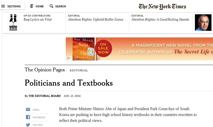일본 총리인 신조 아베와 한국 대통령 박근혜 둘 다 국가의 고등학교 역사교과서가 자신들의 정치적 견해를 반영하도록 다시 쓰여지도록 압력을 넣고 있다.