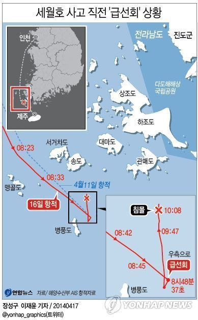 [세월호 침몰]8시49분 무슨일이…항적도 보니 '급선회'