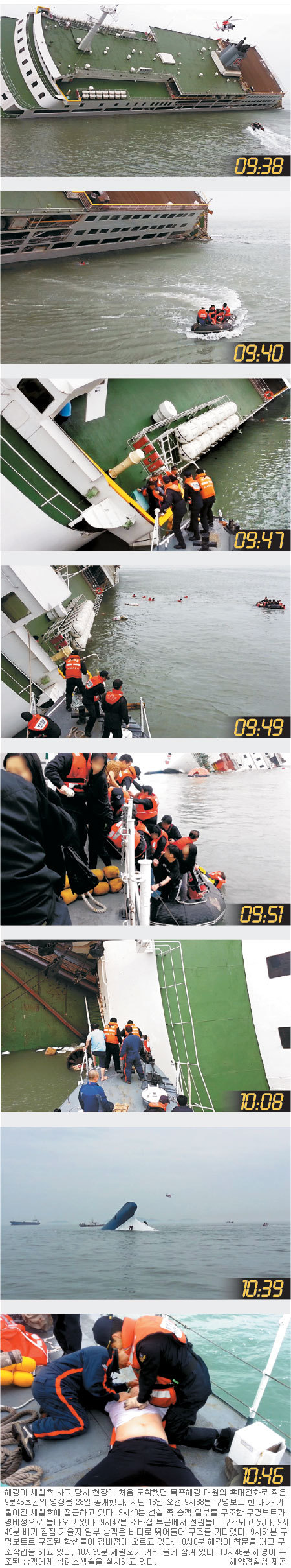 그러나 동영상에는 해경이 선체 내부로 진입해 적극적인 구조 활동을 벌이는 모습이 보이지 않는다. 이런 점을 의식해 동영상 공개를 미뤘다는 의혹으로부터 자유롭지 못할 것으로 보인다.