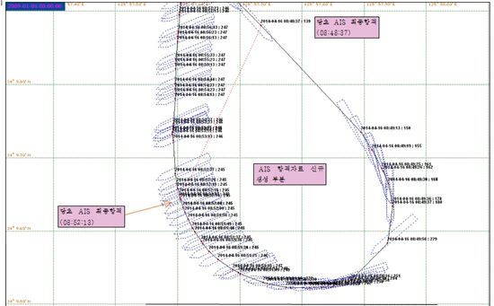 당초 공개된 자료에는 사고 당일인 오전 8시48분37초에 오른쪽으로 100도 이상 꺾었다가 3분36초 뒤인 8시52분13초에 북쪽으로 방향을 꺾어 표류한 것으로 파악됐다. 그러나 중앙해양심판원이 AIS 기록을 복구한 결과 8시48분37초~52분13초까지 3분36초간 유실된 기록이 나타났다.