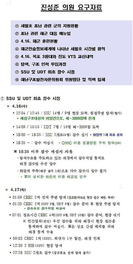 진성준 새정치민주연합 의원이 이날 열린 국회 국방위원회에 앞서 국방부로부터 받은 답변서를 보면, 해군은 세월호 침몰 이튿날인 지난 17일 사고 해역 물살이 가장 느린 '정조 시간'에 해군의 최정예 잠수요원인 해난구조대(SSU) 대원과 특수전전단(UDT) 19명을 사고 해상에 대기시켰지만, 이들은 수색을 위한 잠수는 하지 않았다. 국방부는 진 의원에게 보낸 답변서에 그 이유를 "민간업체(언딘) 우선 잠수를 위해 해경이 (해군 잠수요원들의) 현장 접근을 통제"해 잠수하지 않았고, 군은 "상호간섭 배제를 위해 해경 통제를 수용"했기 때문이라 밝혔다.